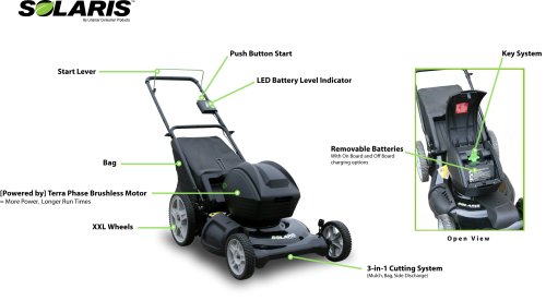Solaris mowers use the most advanced electric motor technology which equals to - more power and longer run-times. Solaris will efficiently cut the average lawn on one charge. It is also green and produces virtually no harmful emissions. Innovative and simple, the push button allows for a quick and easy start while the LED reader displays the amount of power left in the batteries while mowing. With virtually no maintenance and no gas or oil to deal with, all you have to do is? push and go!.......